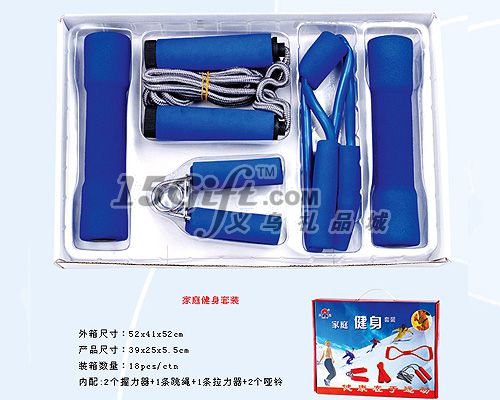 產(chǎn)品說明:內(nèi)配:2個啞鈴+2個握力器+1條跳繩+1條8字型拉力器 彩盒包裝