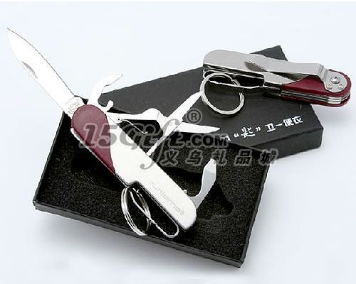 功能:主刀,開罐頭刀、剪刀、開瓶器及一字批頭,鑰匙扣及鑰匙圈