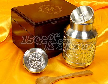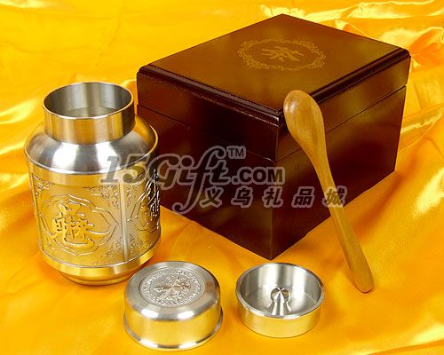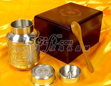錫制茶罐,口徑5cm,高11.5cm,opp袋包。外包裝是紅色木盒,盒內(nèi)有一個小木勺,13cm。有一定起訂量,可以按照客戶來樣制版。