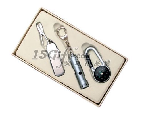 產(chǎn)品配件說明:多功能刀(合金)+LED手電筒(鋅合金)+指南針鑰匙扣(塑料)