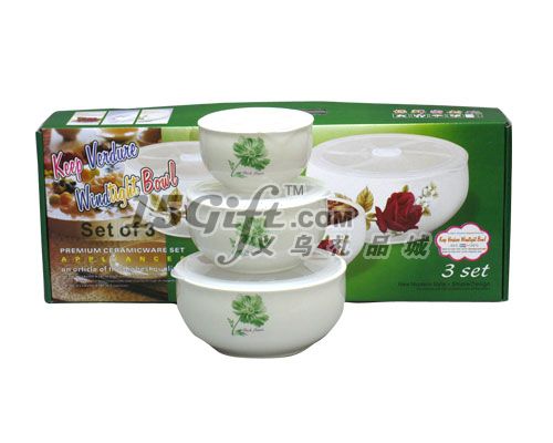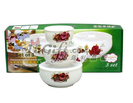 產(chǎn)品材質(zhì)為新骨瓷,材質(zhì)光亮,環(huán)保。保鮮碗三件套,規(guī)格分別為:4寸,5寸,6寸,帶蓋子,提手彩盒包裝,可以定做客戶指定logo,高檔美觀,實用,特別適合商務禮品贈送。
