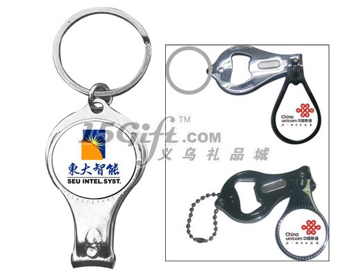 多功能鑰匙扣,功能:鑰匙扣,指甲剪,啤酒開瓶器,可定做客人LOGO,LOGO部份為滴膠LOGO,LOGO直徑為2.6CM,單個卡紙加OPP袋包裝,歡印來電訂購!(包含單色印刷)