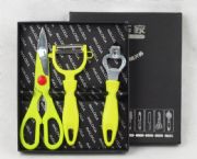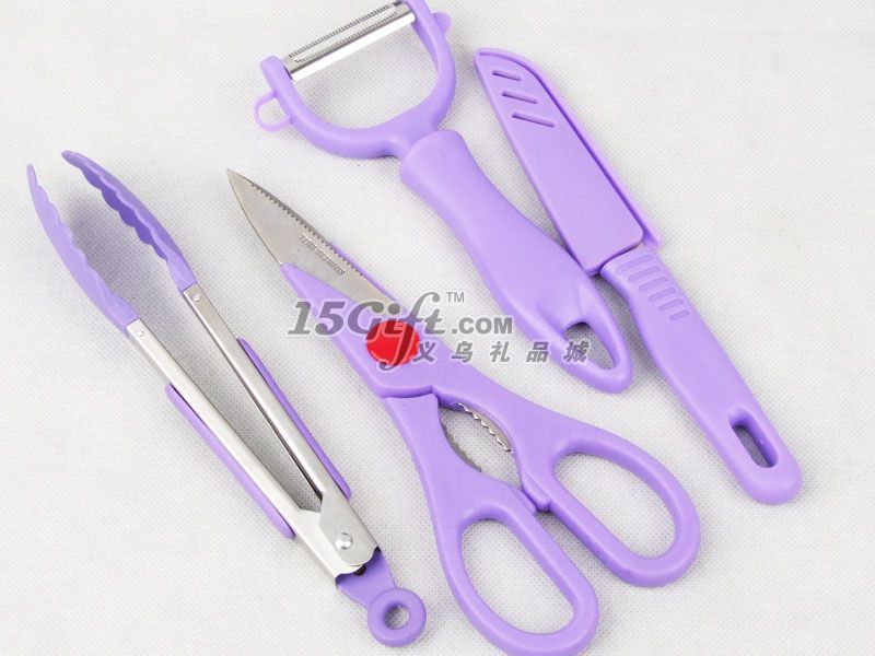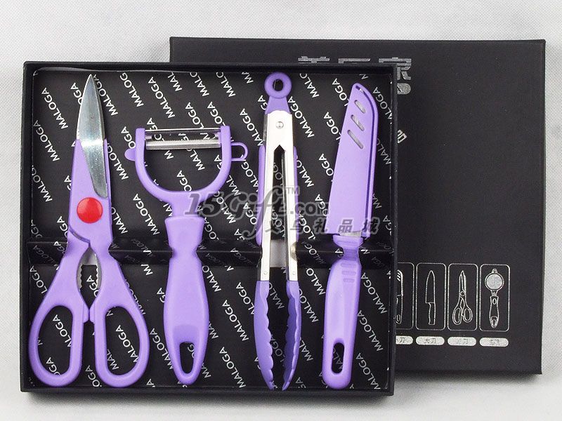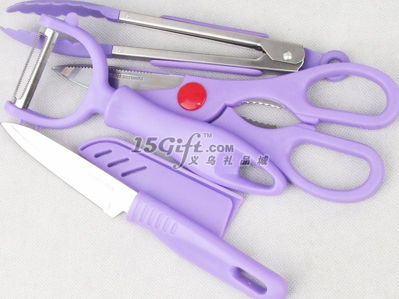 禮品盒包裝,內(nèi)含:食物剪(7.9*20cm)+削皮刀(8*17cm)+食物夾(長21cm)+水果刀(3*20cm)