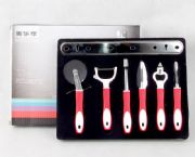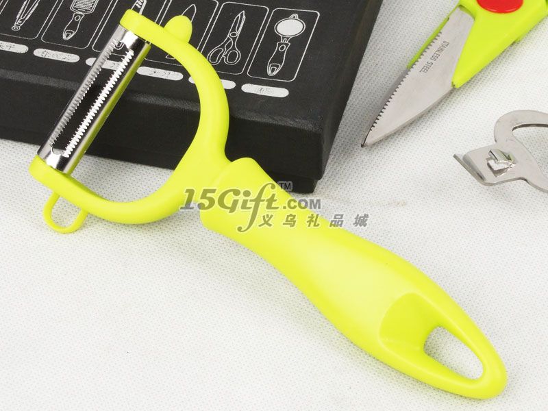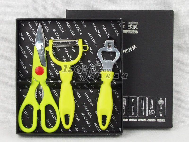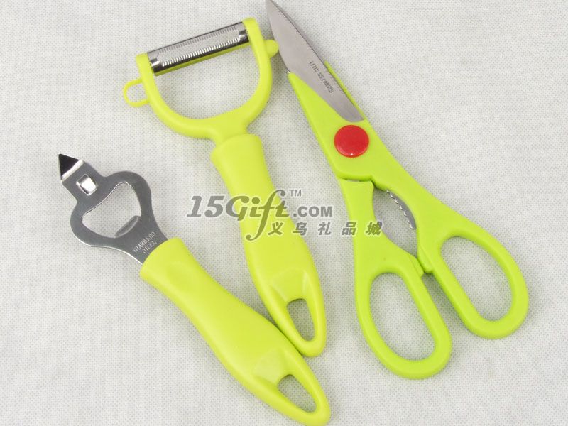 禮品盒包裝,內(nèi)含:食物剪(8*20cm)+削皮刀(8*17cm)+多功能瓶啟(4.3*17.5cm)