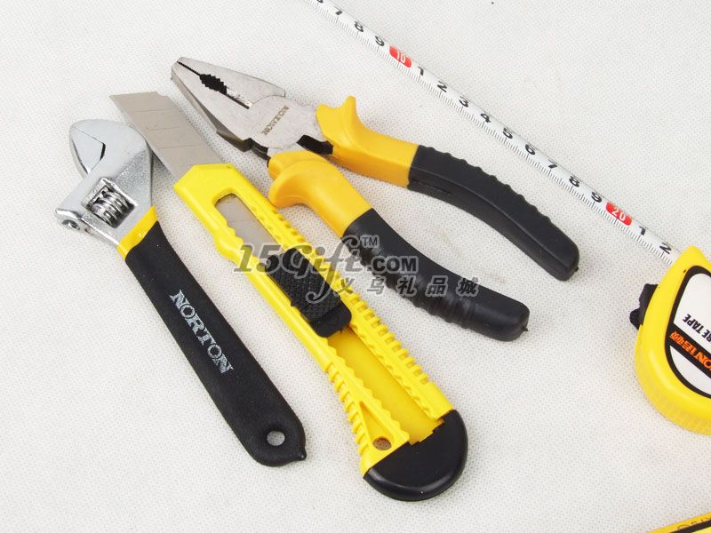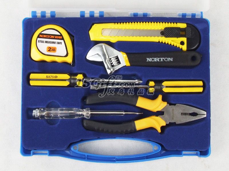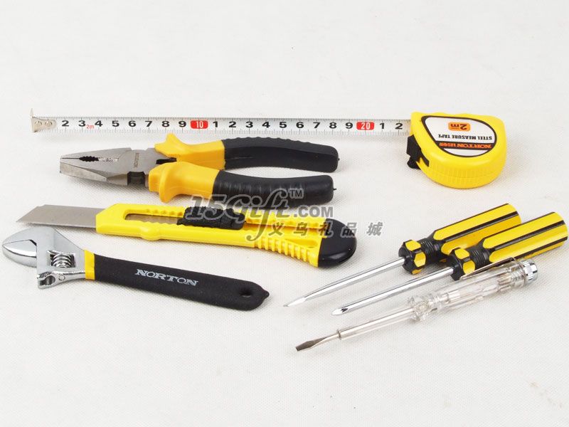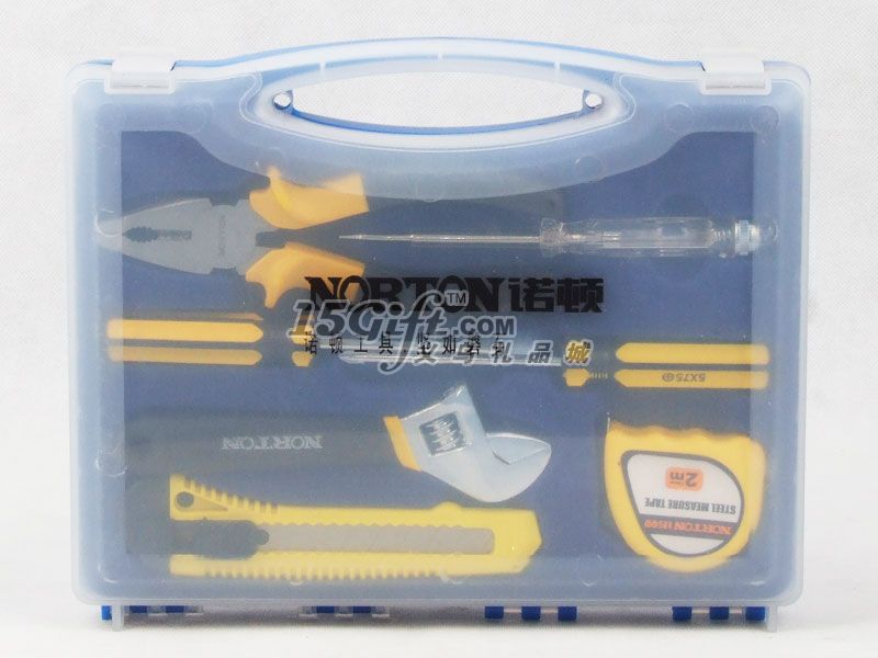 塑料手提盒,內含:鉗子(5.5*16.5cm),電工一字螺絲刀(長14.5cm),十字螺絲刀(長15cm),一字螺絲刀(長15cm),扳手(4.2*15cm),美工刀(4*15cm),卷尺2M。
