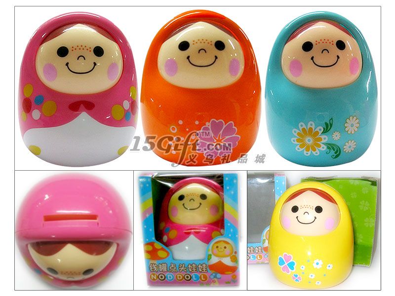 1:點(diǎn)頭娃娃儲(chǔ)蓄罐單個(gè)開(kāi)窗彩盒包裝,144個(gè)一個(gè)大箱,顏色四色混裝。