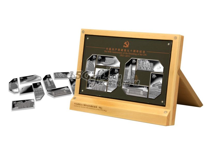 異形組合金銀條系列是建黨90周年貴金屬藏品的點睛之作,該藏品為9枚銀條組合而成,每枚銀條都以我黨的足跡為主題畫面。9枚銀條拼在擺件上即成“90”字樣,寓意建黨90周年,歷史厚重感油然而生。
