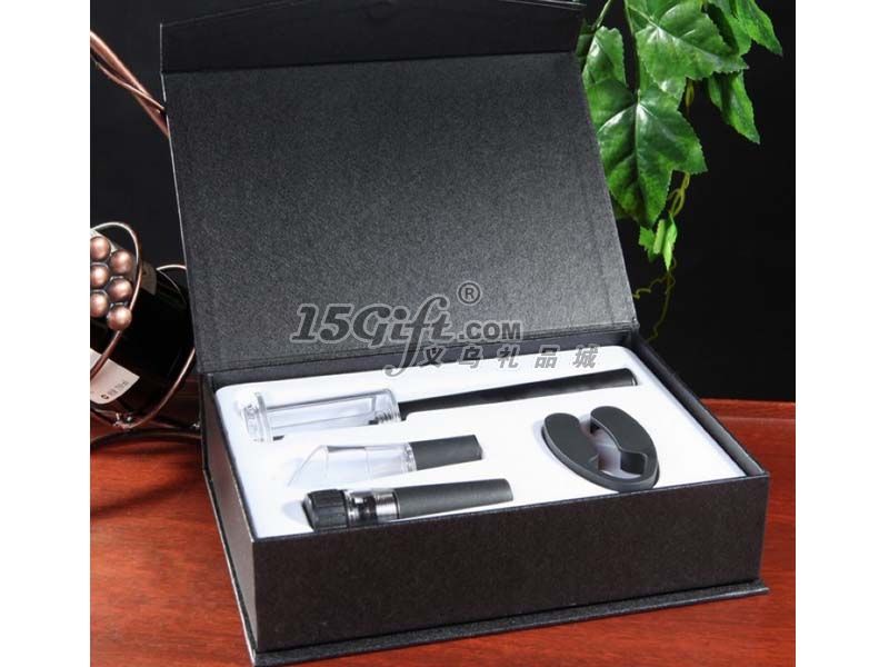 產(chǎn)品配置:ABS氣壓開瓶器、割紙器、倒酒器、真空酒塞。