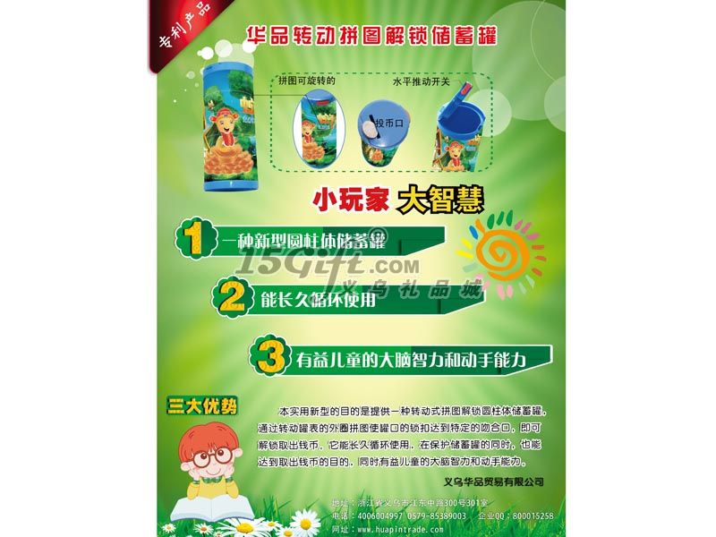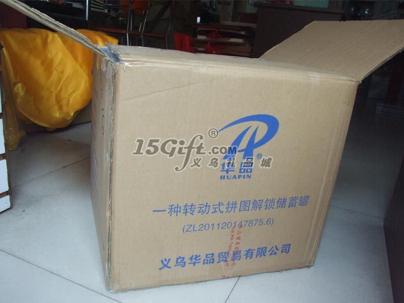 華品轉動拼圖解鎖儲蓄罐,儲錢罐,儲錢盒儲幣罐本實用新型的目的是提供一種轉動式拼圖解鎖圓柱體儲蓄罐(專利號:20112047875.6),通過轉動罐表的外圈拼圖使罐口的鎖扣達到特定的吻合口,即可解鎖取出錢幣。它能長久循環(huán)使用,在保護儲蓄罐的同時,也能達到取出錢幣的目的,同時有益兒童的大腦智力和動手能力。