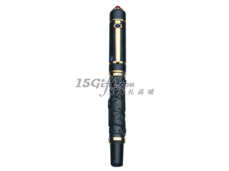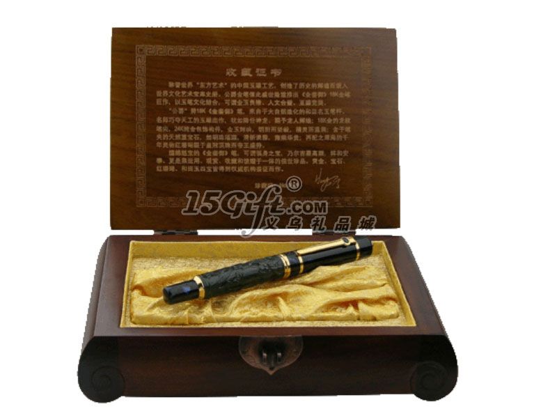 “公爵”牌《金鑾御》18K金筆,得以大自然的恩賜,質(zhì)地細(xì)膩,光澤滋潤的和田青玉,經(jīng)資深玉雕大師精雕大師精雕細(xì)鑿而成的筆桿,那栩栩如生,神龍活現(xiàn)的蛟龍,在祥云中盤纏升騰,一派祥和盛世之勢。鑲嵌在皇冠頂帽和筆夾上的二顆天然青金寶石,似璀璨明珠,黑色天然高級意大利樹脂筆套和筆項,精工細(xì)磨,烏黑锃亮,成為金玉絕妙的陪襯。造型非凡的18K黃金筆尖,雕琢著清晰、俊雅的龍案圖紋;從頂冠、筆夾至每個構(gòu)件,均以24K純金包飾,金光閃爍。