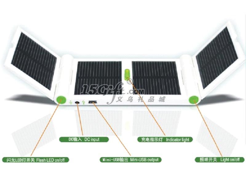 產(chǎn)品介紹: 1.內(nèi)置1200MAH大容量鋰電池,強光下8-10小時即可充滿電. 2.電腦USB對產(chǎn)品直接充電只需要3個小時. 3.太陽能對數(shù)碼產(chǎn)品及手機充電,“500MA,5 V”的輸出. 4.太陽能充電指示燈顯示. 5.手機充電顯示(常規(guī)配置諾基亞6101、8210/摩托羅拉V3+USB母頭). 6.1個LED照明功能,一個閃燈.