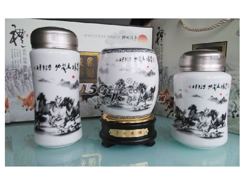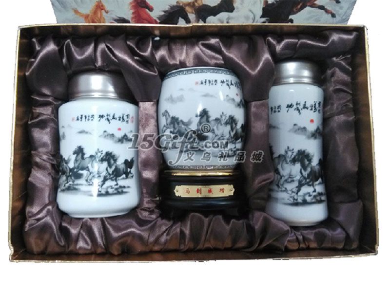 馬到成功陶瓷杯+旋轉(zhuǎn)筆筒+茶葉罐三件套